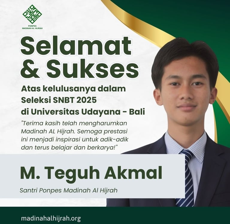 Alhamdulillah, kabar bahagia datang dari keluarga besar Pondok Pesantren Madinah Al Hijrah. Salah satu santri terbaik kami, M. Teguh Akmal, telah dinyatakan lulus dalam Seleksi SNBT 2025 dan diterima di Universitas Udayana – Bali. Sebuah pencapaian yang luar biasa dan patut kita syukuri bersama.